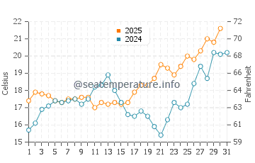 To get an accurate forecast for the water temperature in Velilla Taramay for any chosen month, compare two years within a 10 year range using the chart below. In addition to the sea water temperature in Velilla Taramay, the selected years in the table also show the values of the maximum and minimum temperatures on each of the days of May.